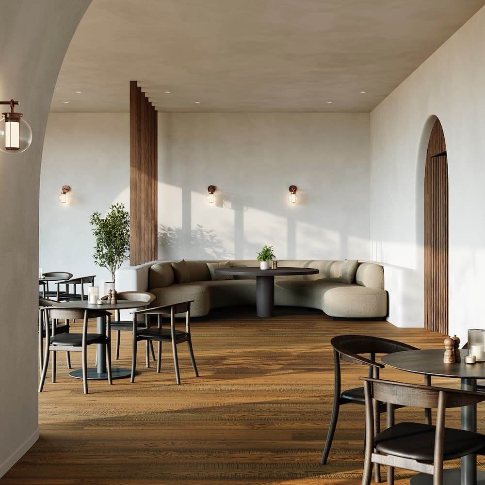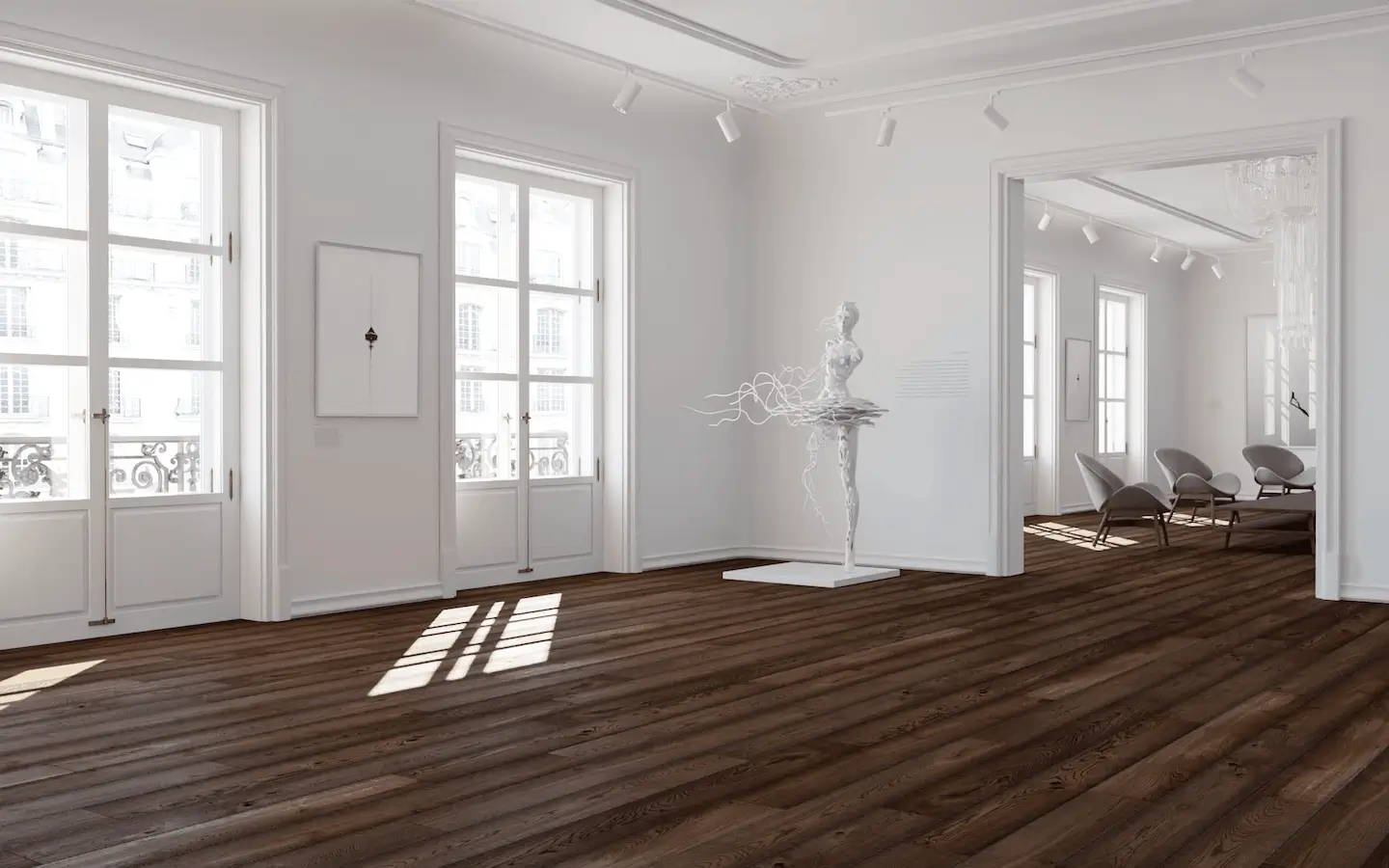 Dřevěné podlahy Harfa Vintage od Esco vynikají nepravidelným katrováním a speciálním povrchem s lineárním reliéfem z řezné pily, který každému prknu propůjčuje jedinečný retro charakter.