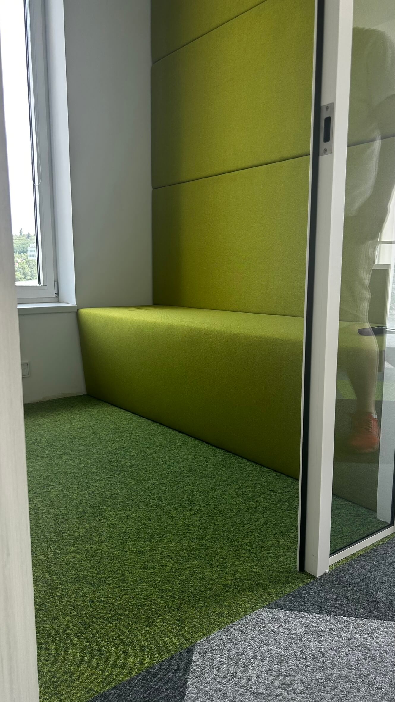 Funkční a současně designové řešení podlahy, které bude zajímavé a bude se vymykat standardnímu provedení koberců v kancelářích požadovali majitelé úspěšné technologické firmy pro své hlavní zázemí. Kancelářské prostory mají dostatek denního světla se skvělým výhledem. Mají atypický půdorys, který je sice složitější pro funkční plánování interiéru, ale dodává mu na zajímavosti.