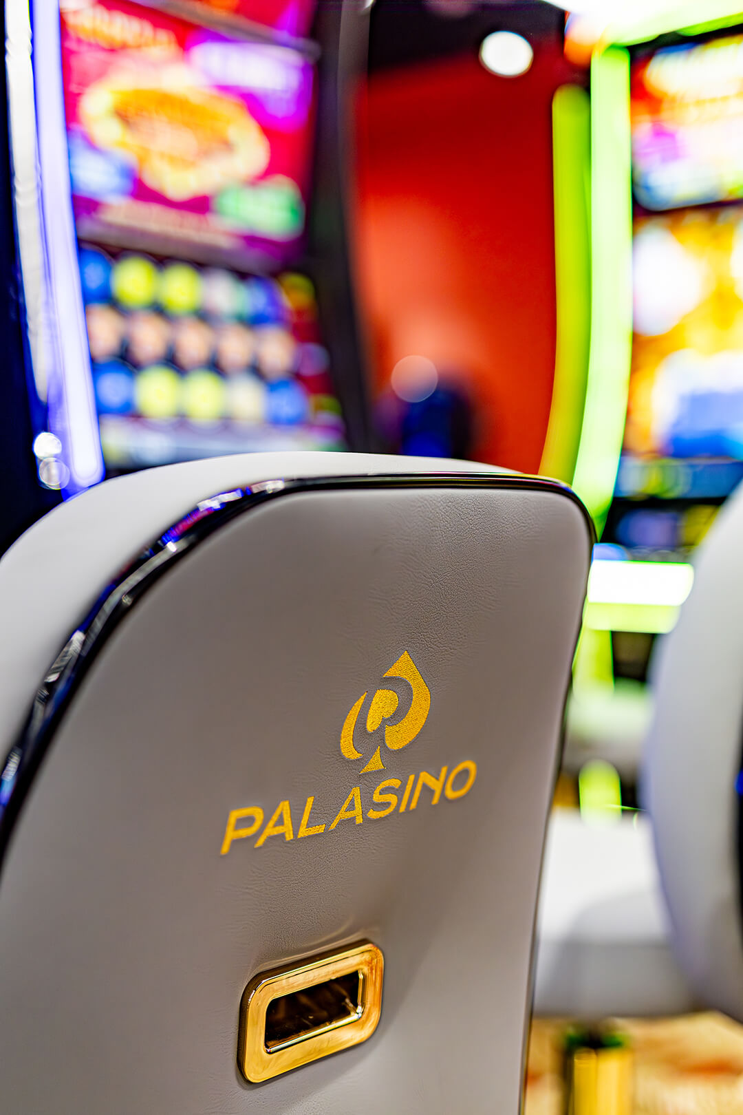 Součástí dodávky byly také podlahové krytiny do zázemí. Zde byl kladen důraz především na bezpečnost a protiskluznost. Do těchto prostor jsme zvolili kombinaci vinylové krytiny v kamenném dekoru a penízkové gumy – robustního kaučukového materiálu se zvýšenou odolností a protiskluzovými vlastnostmi. Vstupní prostory doplnila čistící zóna vyrobená na míru v barvách kasina, včetně loga.